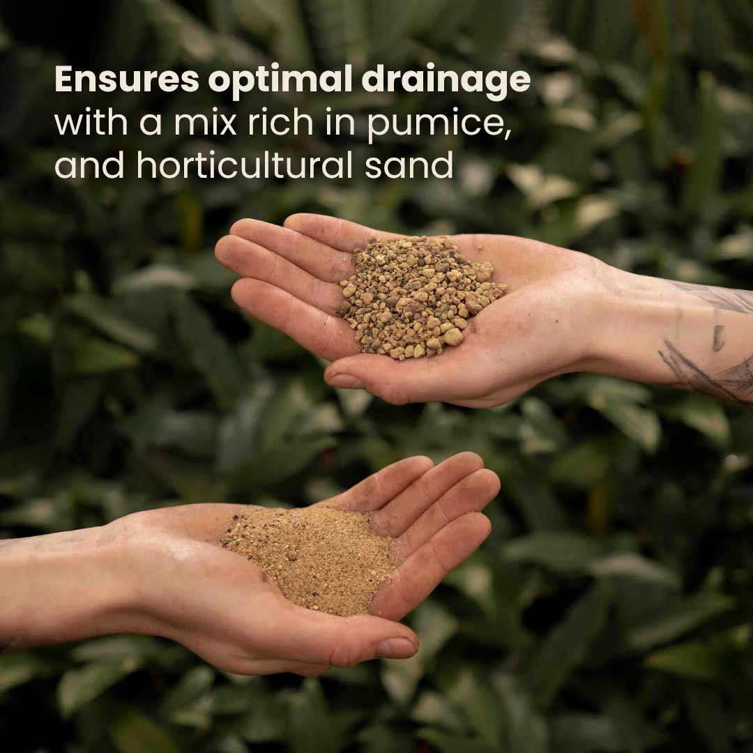 Gritty, airy, and well-draining are the main characteristics of this mix. To avoid overwatering there is a great amount of perlite, pumice and horticultural sand. This prevents root rot. The nutrients are designed to support the root, stem and leaf growth of your plant.