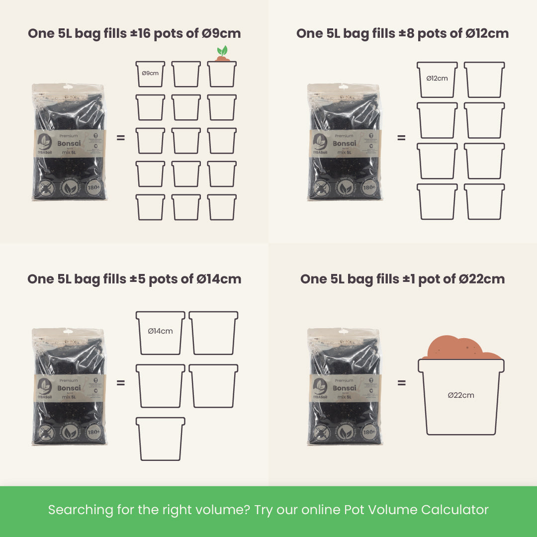 Dai un'occhiata a questo strumento per calcolare il volume del vaso per scoprire quantoTerriccio per Bonsai ti serve.