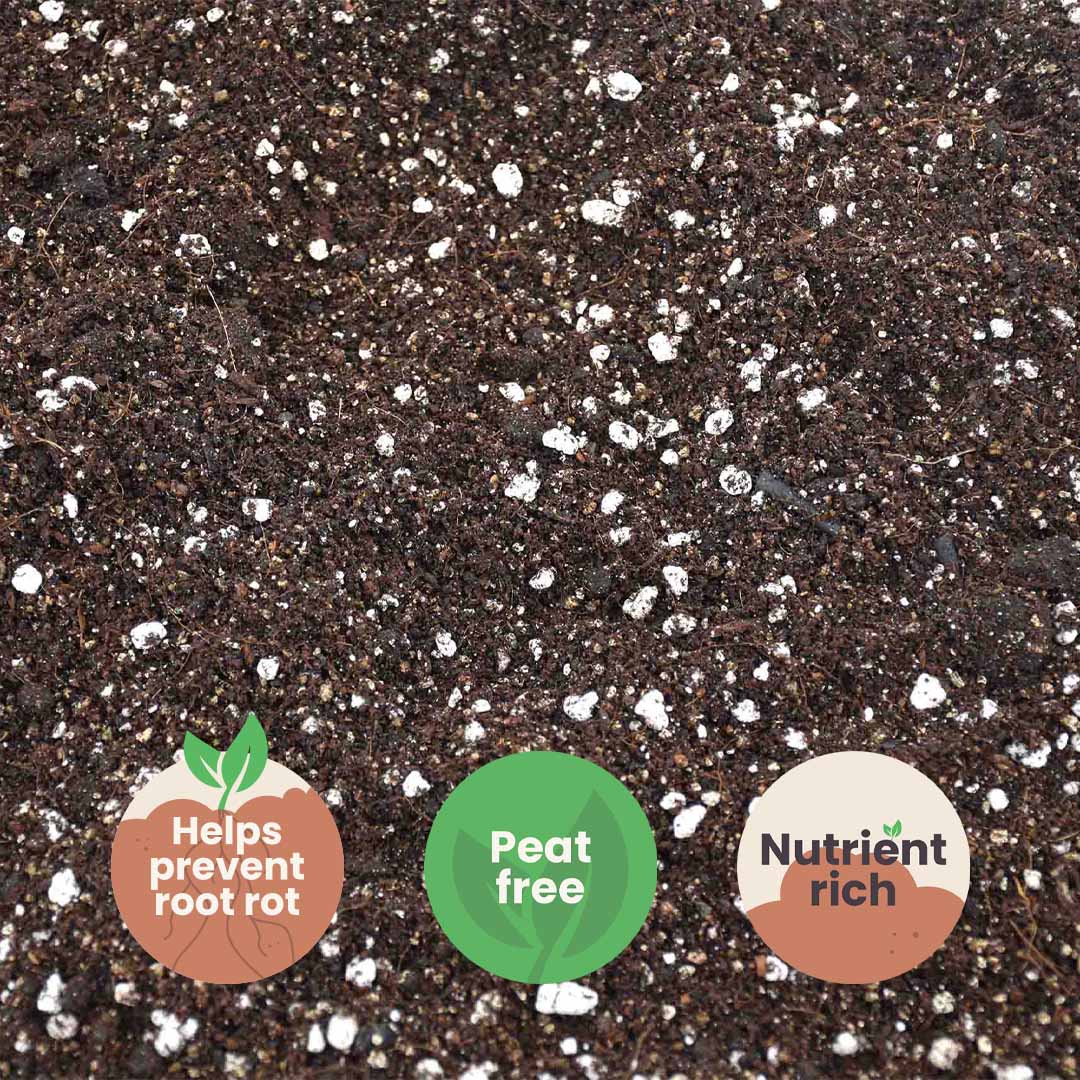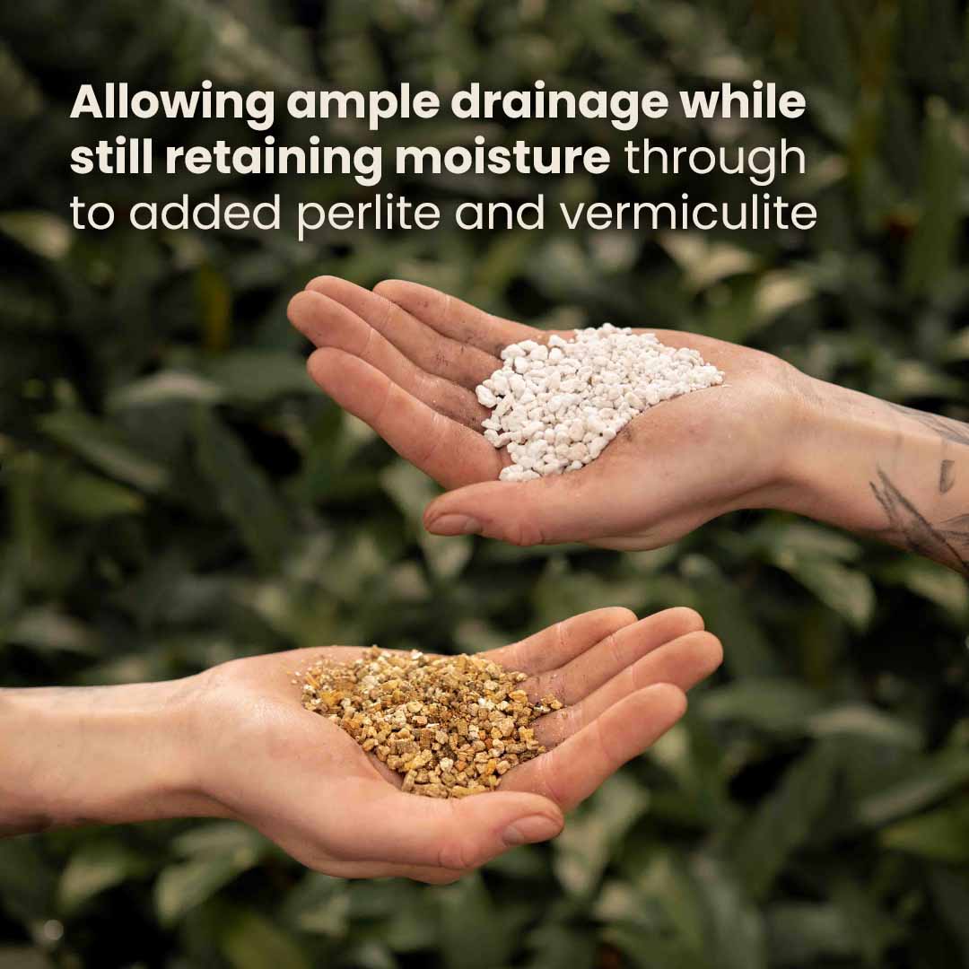 Il mix di Calathea e Maranta ha sia perlit che Vermiculite, permettendo un'adeguata drenaggio pur mantenendo un po' di umidità nel Vermiculite. Questo aiuta a mantenere il terreno uniformemente umido. Il sistema radicale crescerà più sano e grande, e riduce la necessità di annaffiare la pianta troppo spesso, lasciandoti più tempo per ammirare le tue piante!