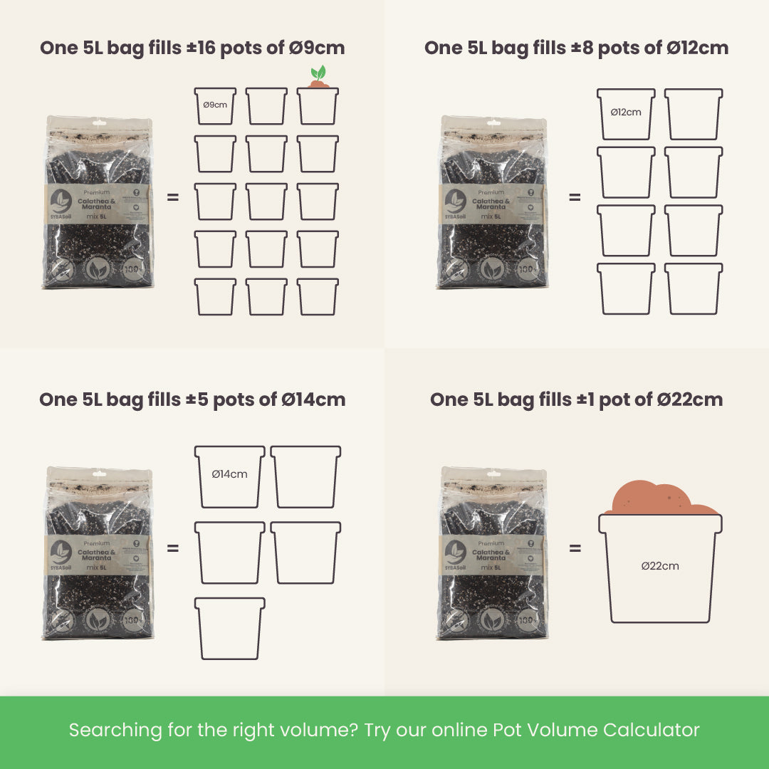 Dai un'occhiata a questo strumento per calcolare il volume del vaso per scoprire quantoTerriccio per Calathea & Maranta ti serve.