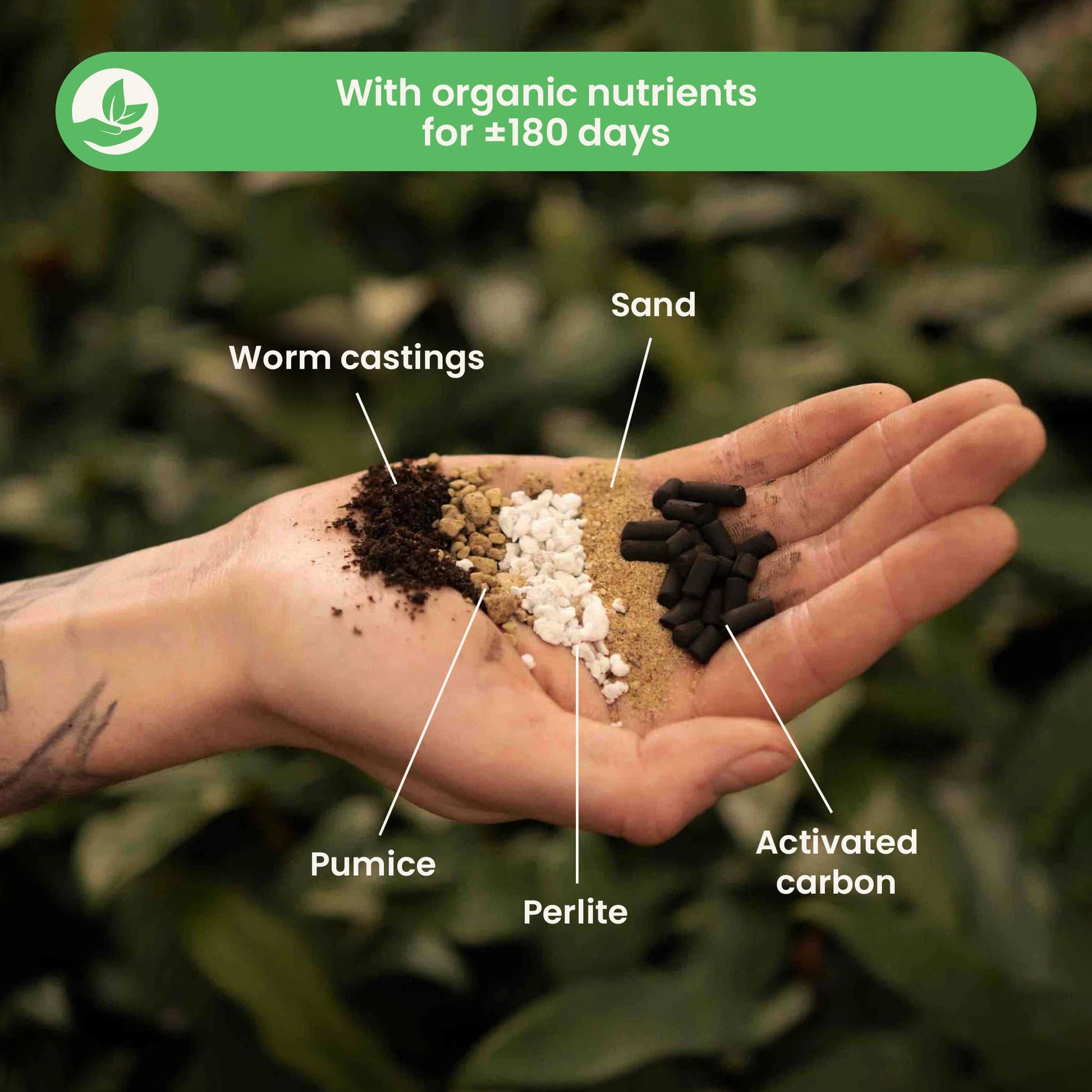 Il Terriccio per Lithops drena molto rapidamente grazie al perlit & Pomice, la sabbia aiuta a mantenere le piante a terra e il piccolo numero di Humus di lombrico aiuta a trattenere un po' d'acqua quando annaffi, in modo che abbiano tutto il tempo necessario per bere.